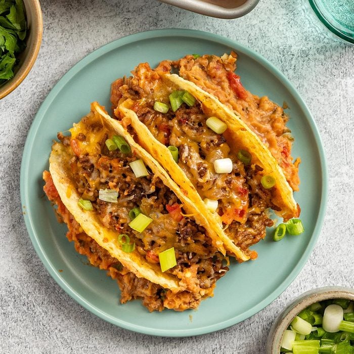 This taco recipe takes classic taco ingredients and gives them a fresh approach by baking the shells upright in refried beans and tomatoes. The bottoms gets soft, and the tops stay crisp and crunchy. —Patricia Stagich, Elizabeth, New Jersey