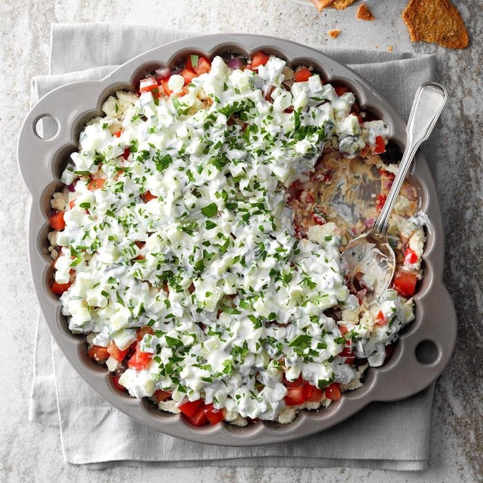 I like traditional seven-layer Mexican dip, but I love Mediterranean ingredients even more. When I made this mashup, my husband wolfed it down. And he won’t even touch hummus or Greek olives on their own! —Bee Engelhart, Bloomfield Township, Michigan
