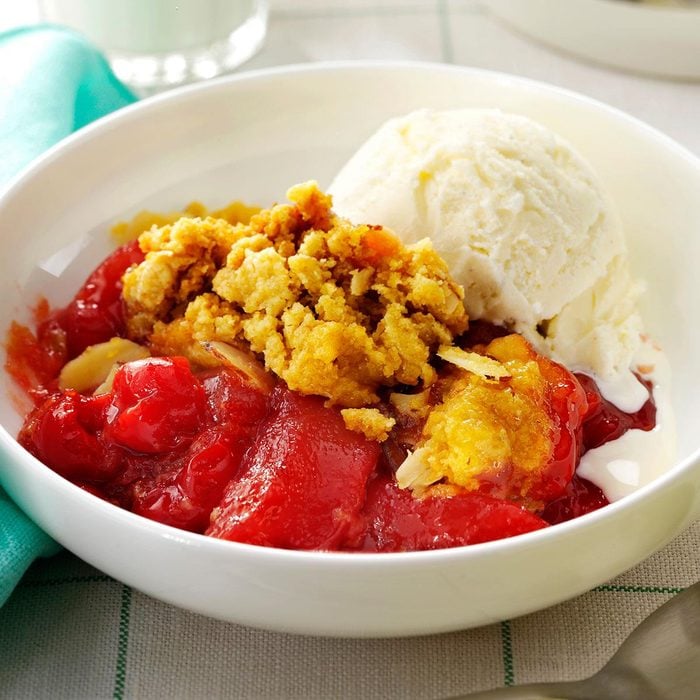 A dollop of whipped topping adds a nice finishing touch to this satisfying crumble. Sometimes I drizzle a little flavored coffee creamer on top instead of the whipped topping. —Nancy Sousley, Lafayette, Indiana