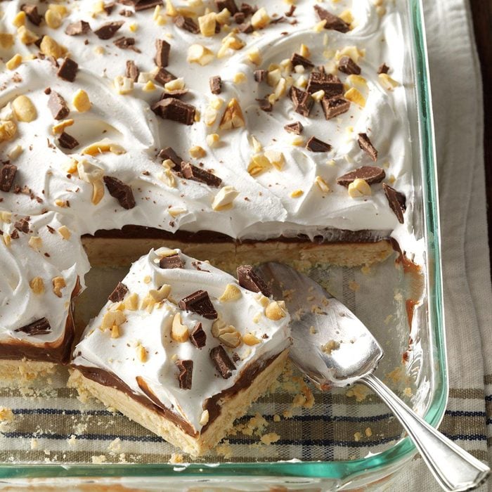 When I was in high school, I took these sweet and crunchy squares as a dessert for graduation parties. I still make them for family and friends who love the classic combination of chocolate and peanut butter. —Christy Asher, Colorado Springs, Colorado