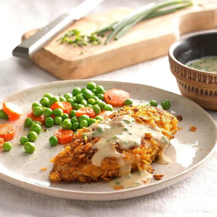 To make this easy weeknight dinner lighter (and a little bit faster), cook the chicken without breading. Simply coat the chicken with salt and pepper, as well as the dried herbs, before cooking in a skillet.