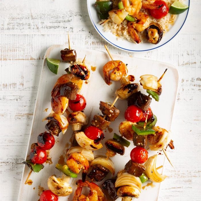 In this simple dinner, cubes of marinated steak are skewered with shrimp and veggies, then grilled. It’s easy to swap out the ingredients for kabobs, as long as they hold up well on the grill. Try using zucchini, asparagus, yellow squash—even pineapple!