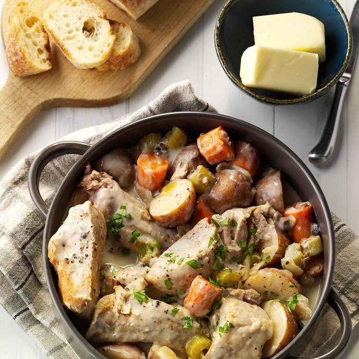 Usually coq au vin takes hours, but to make this red wine-braised chicken recipe weeknight friendly, our recipe uses boneless, skinless chicken thighs instead of a bone-in bird.