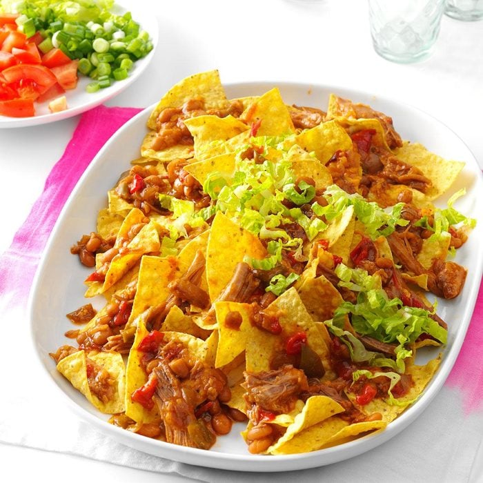While home from college, my daughter made these tempting pork nachos—her first recipe ever. My son and I couldn't get enough. —Carol Kurpjuweit, Humansville, Missouri