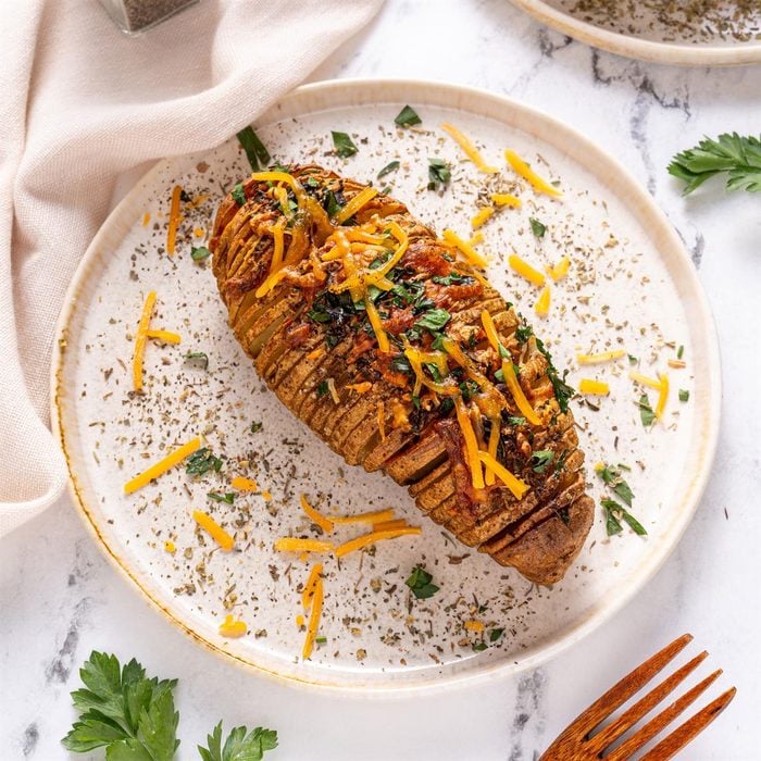 For a nifty way to spice up plain old potatoes, try Tressa Surdick's recipe. To make them, she slices the spuds, then seasons them before baking. "Just before they're done, I sprinkle cheese on top of each potato. Our guest always rave about the," Tressa pens from Bethel Park, Pennsylvania. (To make the cutting easier, Tressa share this tip: "Place the handle of a wooden spoon along the bottom of the potato—this will prevent your knife from going all the way through.")
