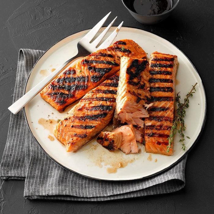 Here’s a prime example of salmon’s ability to transform with strong flavors. A rich glaze of soy sauce, red wine vinegar and lemon soaks into the fish while fresh Parmesan crusts the outside.