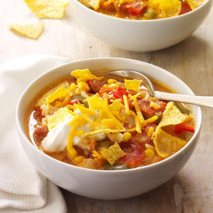 We first sampled this chili-like taco soup recipe at a church dinner. What a warming dish for a cold day. And because it uses packaged seasonings with several cans of vegetables, it's a snap to prepare. —Glenda Taylor, Sand Springs, Oklahoma