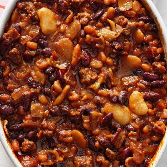 With ground beef and bacon mixed in, these satisfying beans are a big hit at backyard barbecues, church picnics and at Father’s Day celebrations.