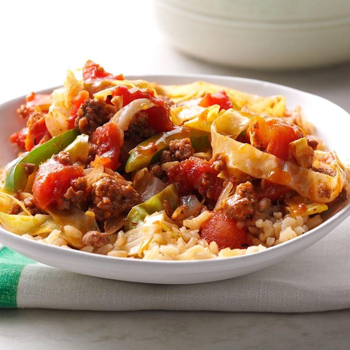 Sorry, tuna noodle, we have to try something new! This inventive casserole is flavorful and filling, thanks to ground beef, bacon, tomato sauce, rice, mozzarella cheese, spices and (you guessed it) cabbage.