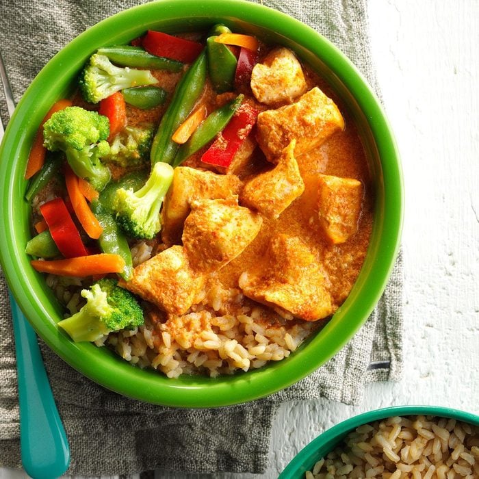 I recreated a favorite red curry chicken dish from a restaurant, and now I cook it almost weekly for my family. On a busy night, frozen stir-fry veggies really speed things up. —Mary Shenk, DeKalb, Illinois
