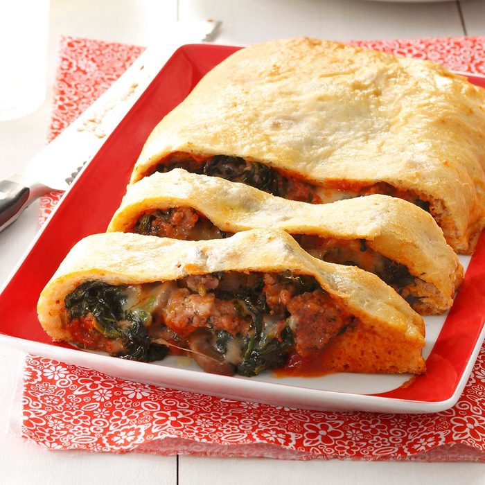 My teenage daughter and I have been experimenting in the kitchen to re-create some old-time family dishes. This calzone with spinach and sausage is definitely a favorite. Using a refrigerated pizza crust, it’s a cinch to prepare one for us or several for a crowd. —Terri Gallagher, King George, Virginia