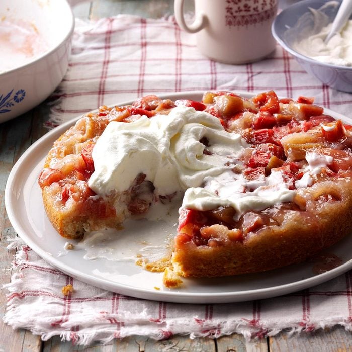 I’ve baked this cake every spring for many years, and my family loves it! Use your own fresh rhubarb, hit up a farmers market or find a neighbor who will trade stalks for the recipe! —Helen Breman, Mattydale, New York