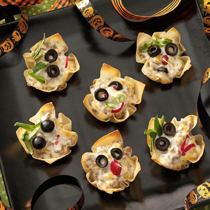 Use vegetable scraps to create ghoulish monster faces on each wonton dip cup. Cut leftover wontons into fun Halloween shapes with small cutters and bake until lightly browned. —Betty Huddleston, Liberty, Indiana