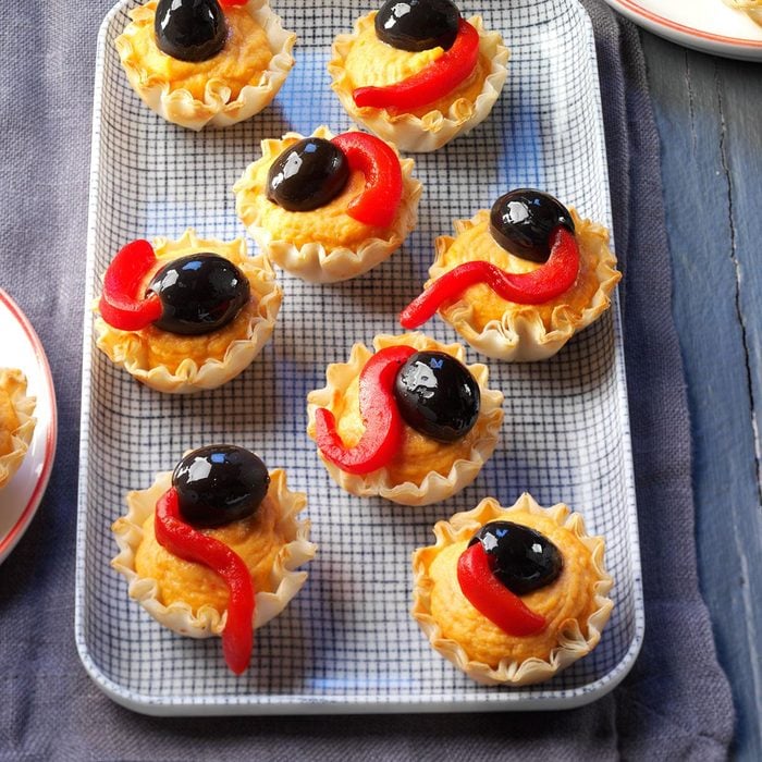 Friends often ask me to make my hummus dip for parties. One year at Halloween, I decided to take it further by piping it into phyllo shells and topping it with olives and roasted red peppers to make creepy creatures. —Amy White, Manchester, Connecticut