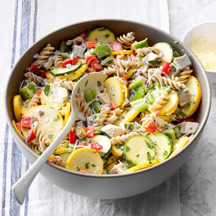 This easy pasta salad is loaded with fresh veggies, and the classic ranch dressing makes it appealing to kids. —Julie Peterson, Crofton, Maryland