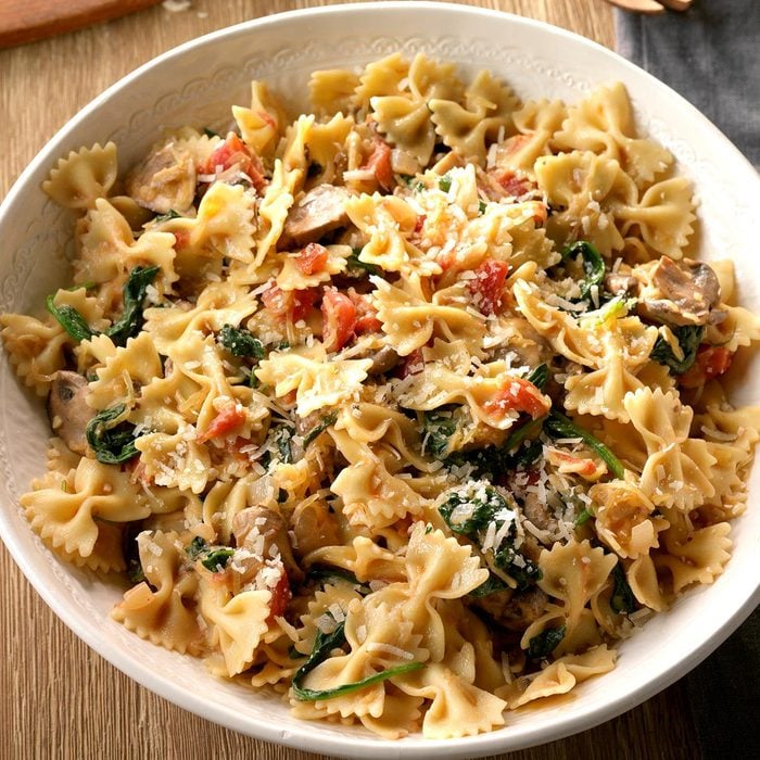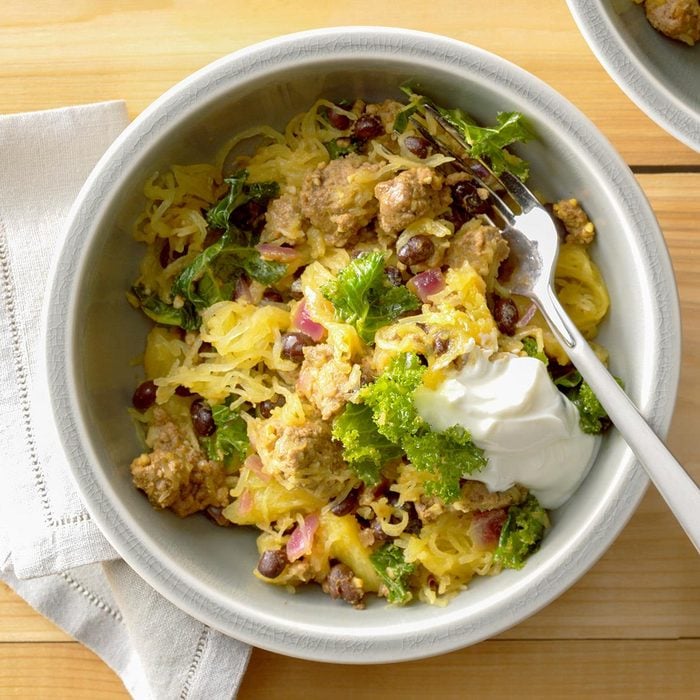 Spaghetti squash and bow ties make this meatless dish hearty and filling. Add a can of black beans if you’d like more protein, and switch up the tomatoes for variety. Try using Italian diced tomatoes or diced tomatoes with mild green chiles. —Anne Lynch, Beacon, New York