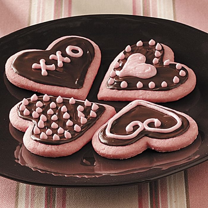 Strawberry-flavored, pink-tinged and heart-shaped, these cookies are Valentine’s Day come to life. The simple chocolate glaze on top creates an on-theme chocolate-covered strawberry flavor.