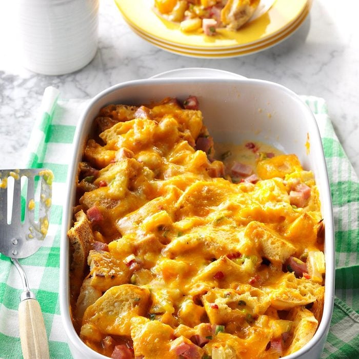 We start this strata recipe the night before so it’s ready for the oven the next day. That way, we don’t have to deal with the prep and dirty dishes first thing in the morning! —Debbie Johnson, Centertown, Missouri