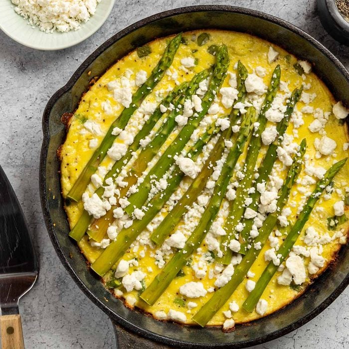 Asparagus studs the filling of this attractive green frittata. The frittata mixture cooks first on the stovetop, so watch the heat under the skillet to prevent the bottom from browning too much, which can turn the eggs into a tough crust.