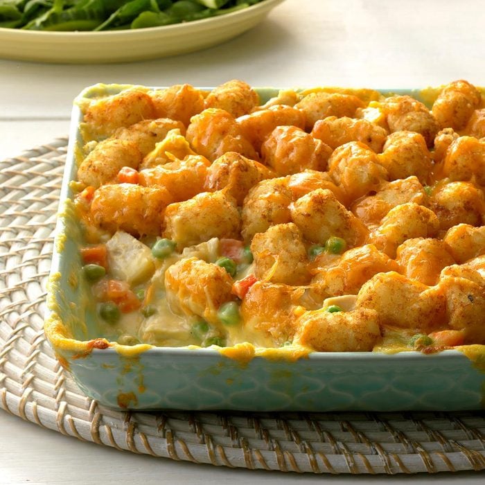 You’ll please everyone in the family with this inviting and filling chicken Tater Tot hot dish. It tastes like a chicken potpie topped with Tater Tots. —Fran Allen, St Louis, Missouri