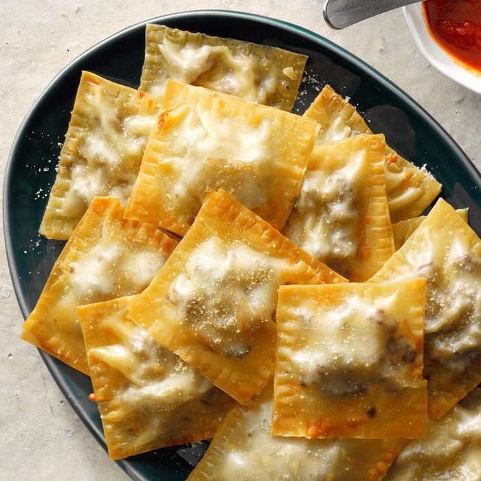 I wanted to make an easy appetizer with my favorite pasta, cheese ravioli, but didn't want the mess of frying. I used pesto and bread crumbs for a crust, and broiled them for a little crunch. —Rebecca, Guffey, Apex, North Carolina