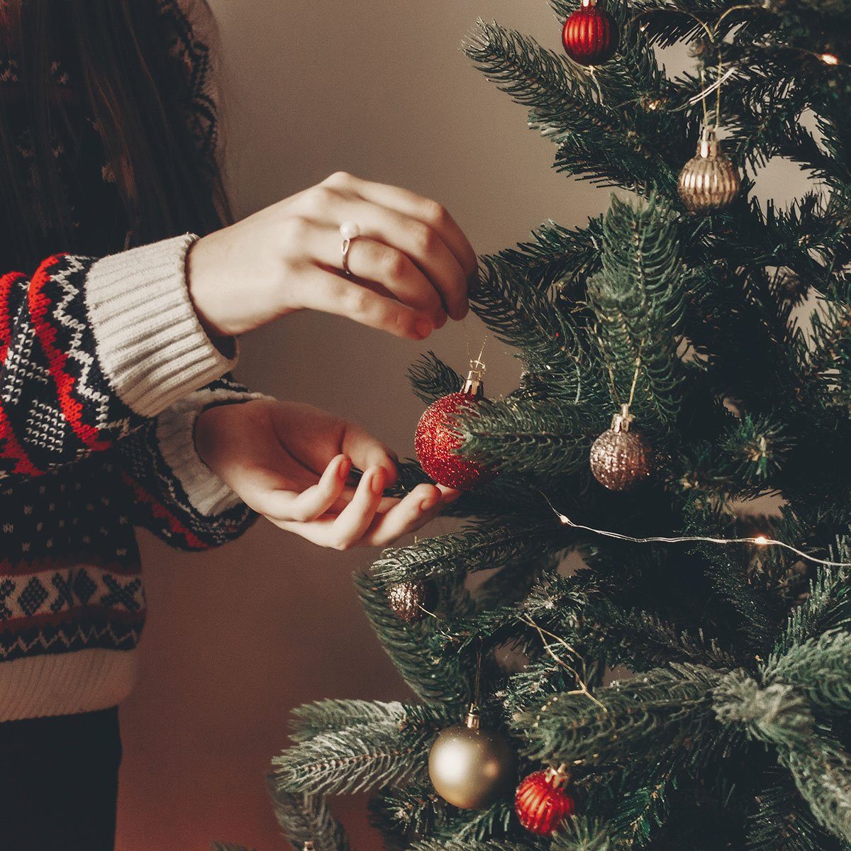 Once your tree is fully set up in the perfect location, it’s time to start the decorating process. The lights should go on the tree before anything else. Before you put them on the tree, test your light strands to make sure they’re functioning correctly. Start from the bottom and work your way up, weaving each strand between branches without overlapping the cords. A good way to check to see if you’ve got the whole tree covered is to turn off the rest of the lights in the room, take a step back and squint at your fully lit Christmas tree. This will cause any bare sections to stand out as obvious dark spots. Adjust and rearrange the lights, filling in those dark spots until the lights are uniformly spread out across the whole tree.