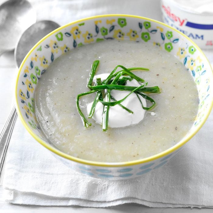 When I was a child, my mother made potato and onion soup because it was affordable and fast. I’ve trimmed the calories, but it’s still a comforting family favorite. —Courtney Stultz, Weir, Kansas
