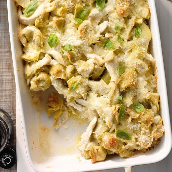 This rich and savory pasta bake includes spinach tortellini and artichoke hearts. With a mayo and asiago cream sauce, it resembles a spinach and artichoke dip.