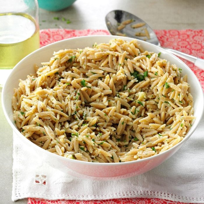 This buttery pasta dish calls for orzo, which cooks quickly and is a nice change from ordinary pasta shapes. "This fantastic recipe was inspired by a similar dish I once tried. It makes a superb side dish anytime. The garlic and Parmesan cheese really stand out. —Stephanie Moon, Boise, Idaho