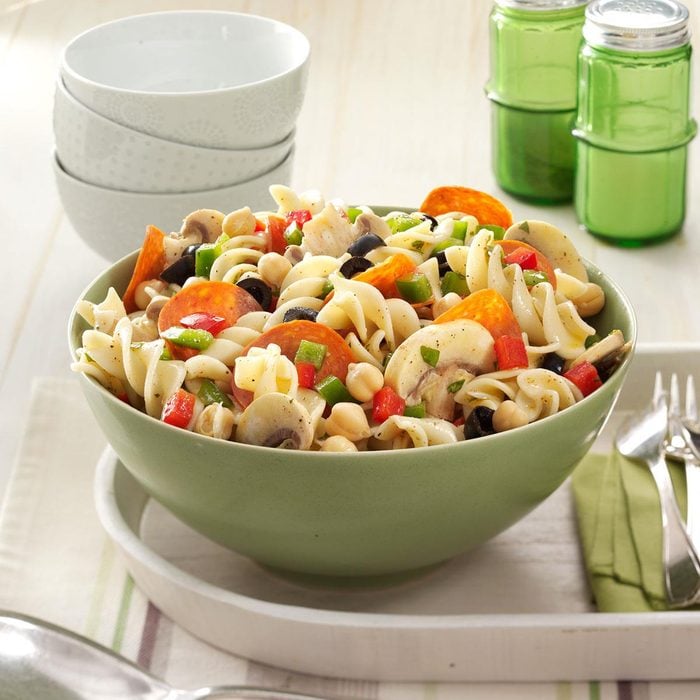 With pasta salad, it’s easy to change up ingredients. We like to add grilled chicken and pine nuts, and sometimes we substitute black beans for the garbanzo beans. —Julie Kirkpatrick, Billings, Montana
