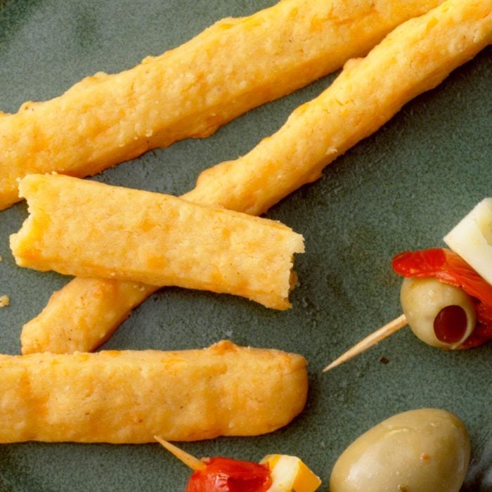 The five ingredients in this cheese straws recipe transform into long, crisp cracker sticks. The hand-held snacks make for easy mingling at parties.—Elizabeth Robinson, Conroe, Texas