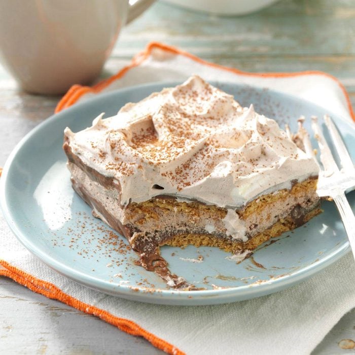 It's amazing how the layers of this eclair torte soften overnight into a cakelike texture. Just before serving this dessert, I like to dust the top with cocoa. —Agnes Ward, Stratford, Ontario