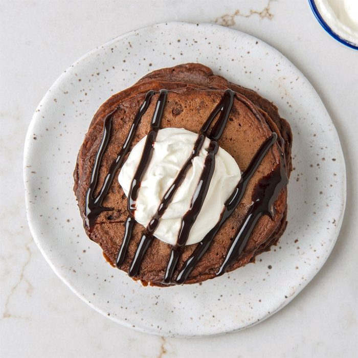 This chocolaty take on classic buttermilk pancakes is a dream for chocolate lovers. Cocoa powder, chocolate chips and chocolate syrup all find their way into or on top of these pancakes. Definitely serve them with a side of bacon or sausages.