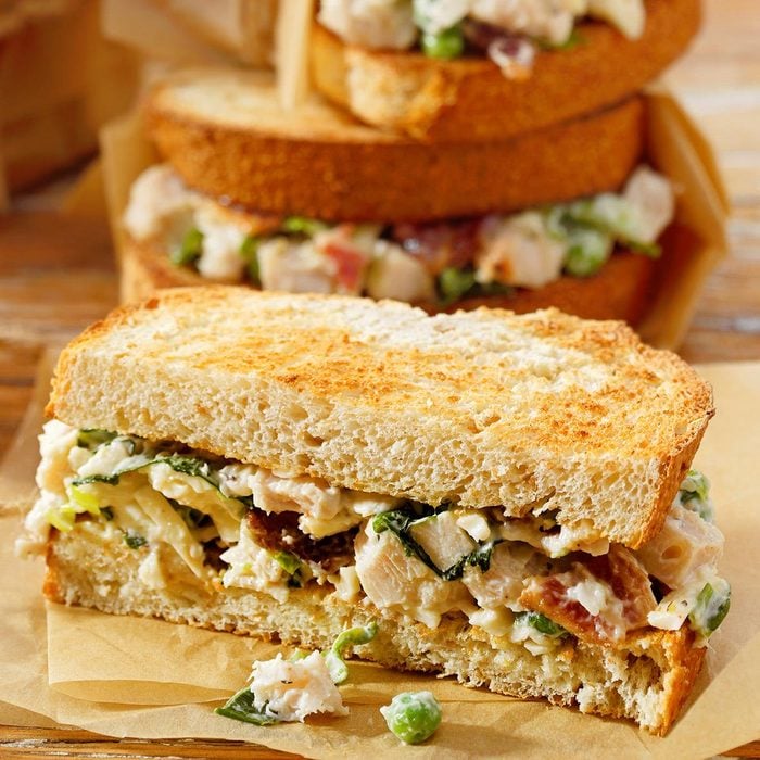 Inspired by a delicious turkey salad sandwich at a local deli, I developed my own version to suit my family’s tastes. Serve this on camping trips for an easy camper food. Precooked bacon and canned-or leftover-turkey make it a snap to prepare! —Merrijane Rice, Bountiful, Utah