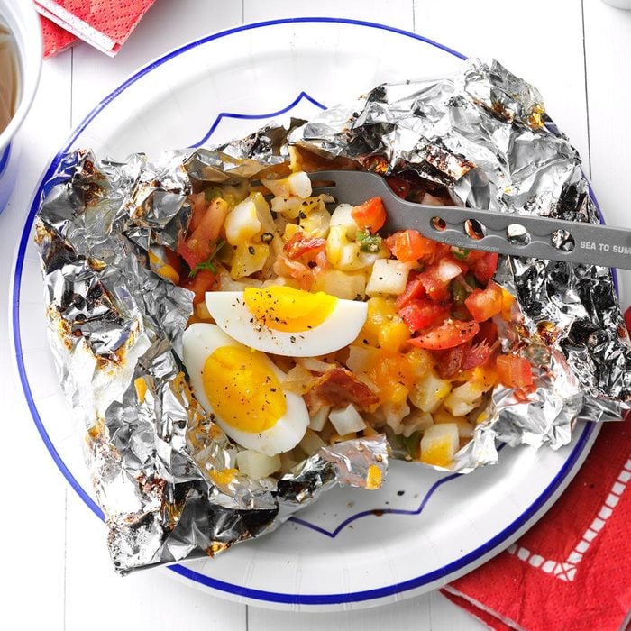 Dining by the campfire? This easy packet of potatoes, bacon and cheese makes a terrific hash. We like to serve it with eggs and fresh pico de gallo. —Gina Nistico, Milwaukee, Wisconsin