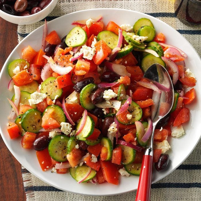 The heart of a Greek salad recipe is in the olives, feta, cucumbers and tomatoes. Dress it with olive oil and vinegar, then add more olives and cheese. —Arge Salvatori, Little Ferry, New Jersey
