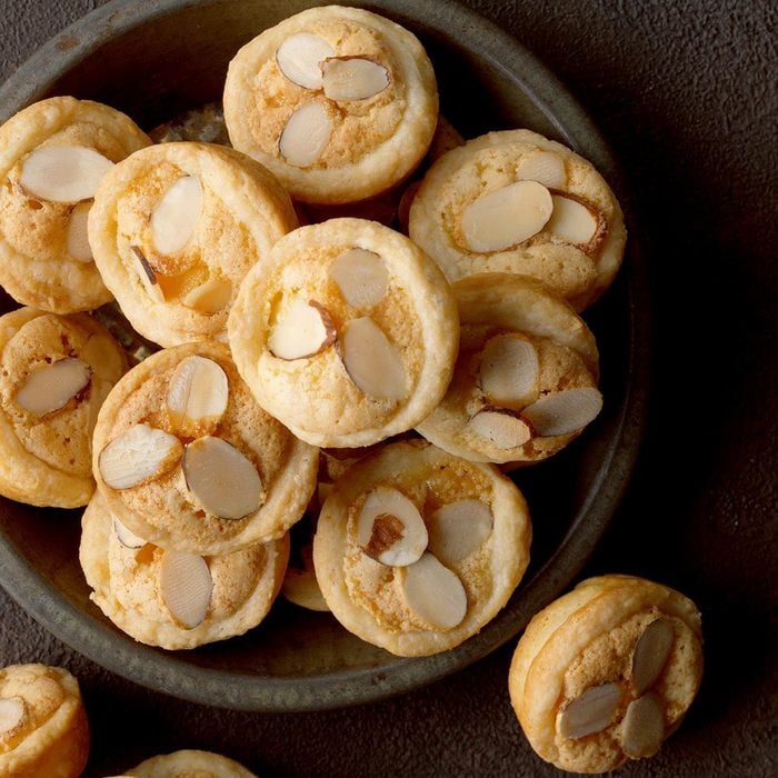 These bite-size beauties look and taste gourmet, but they're easy to make and boast a delicate almond flavor. The hidden jelly surprise and pretty nut accent make them a nice addition to any treats tray. You can make them in advance and freeze them for up to three months, if you like. —Lorraine Caland, Shuniah, Ontario