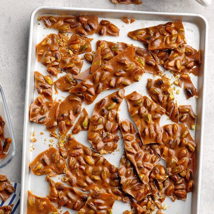 Here's a fun twist on traditional brittle. Pistachios not only add wonderful taste to the rich, buttery candy, but delicious texture. —Valonda Seward, Coarsegold, California