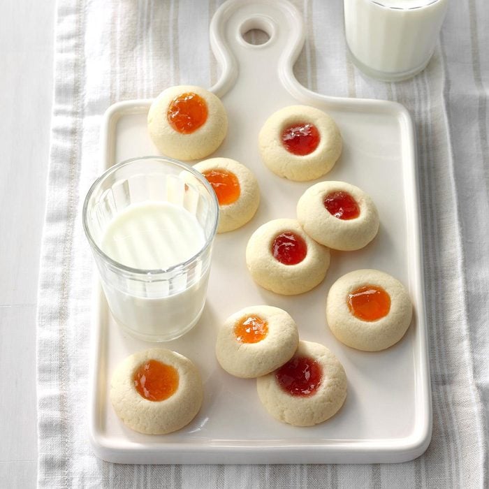 These buttery little rounds add beautiful color to a platter of treats. Fill the thumbprint in the center with any fruit preserves you like. —Taste of Home Test Kitchen