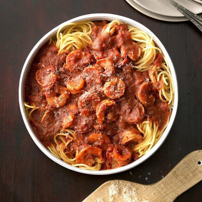 Flavorful marinara sauce simmers for just a few hours. Right before mealtime, toss in the shrimp to cook quickly. Serve over hot spaghetti for a delicious weeknight dish that feels dressed up. —Sue Mackey, Jackson, Wisconsin