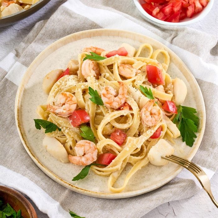 I like to serve this lovely seafood Alfredo, featuring scallops and shrimp, with crusty Italian bread. Sprinkled with tomato and parsley, the dish looks as mouthwatering as it tastes. —Jimmy Spellings, Oakland, Tennessee