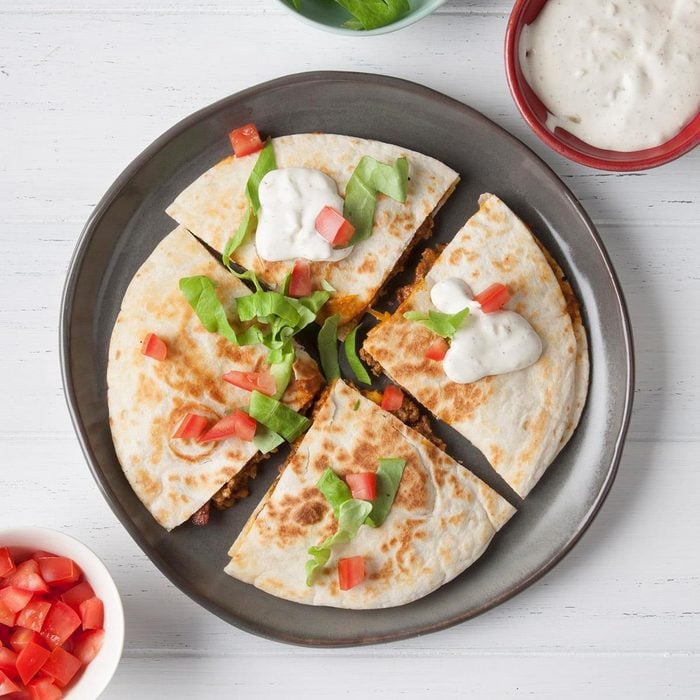 I created these fun cheeseburger-quesadilla mashups in honor of my family's two favorite foods. They are so yummy and easy to make! —Jennifer Stowell, Deep River, Iowa