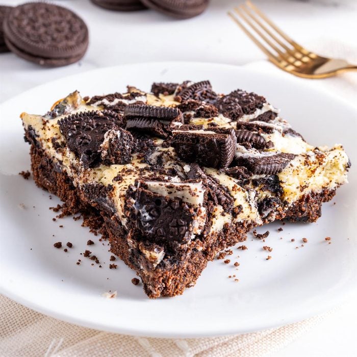 You won't want to frost these brownies, since the marbled top is too pretty to cover up. Besides, the indulgent cream cheese layer makes them taste as if they're already frosted. The crushed cookies add extra chocolate flavor and a fun crunch. —Darlene Brenden, Salem, Oregon