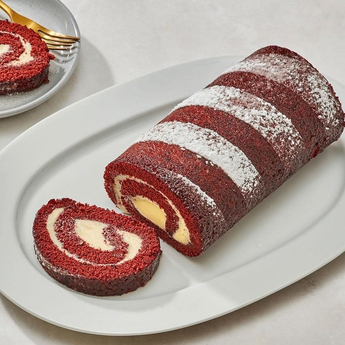 Get ready for oohs and aahs when you set this on the table. A creamy white chocolate filling rolls up beautifully inside a layer of fluffy red velvet cake. To make it extra festive, dust stripes of confectioners' sugar for a candy cane look. —Tonya Forsyth, Waurika, Oklahoma