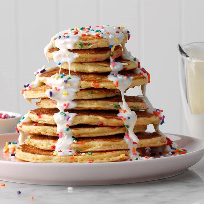For my kids’ birthdays, I like to make these cake mix pancakes. Frosting and more sprinkles seal the deal! —Dina Crowell, Fredericksburg, Virginia
