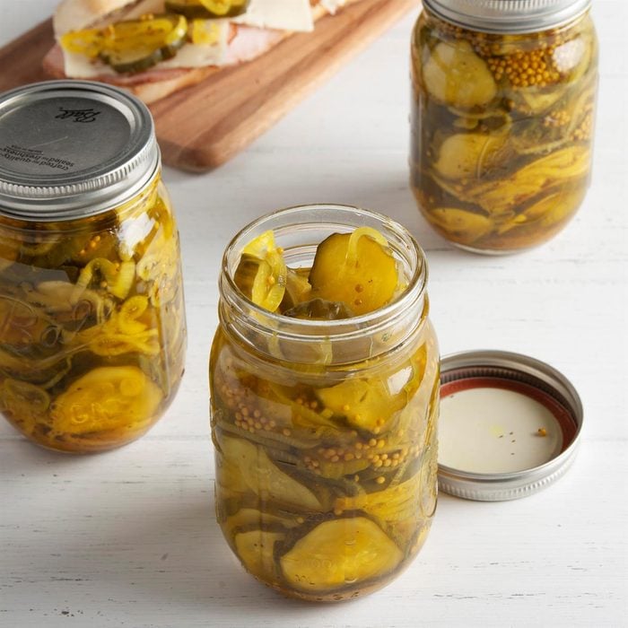 I pack away homegrown cucumbers every summer. This recipe is based on the pickled veggies in Brown Eggs and Jam Jars by Aimee Wimbush-Bourque, but I’ve made it less mustardy and more garlicky to fit my family’s tastes. This method keeps them incredibly, refreshingly crunchy. —Ellie Martin Cliffe, Taste of Home Digital Deputy Editor