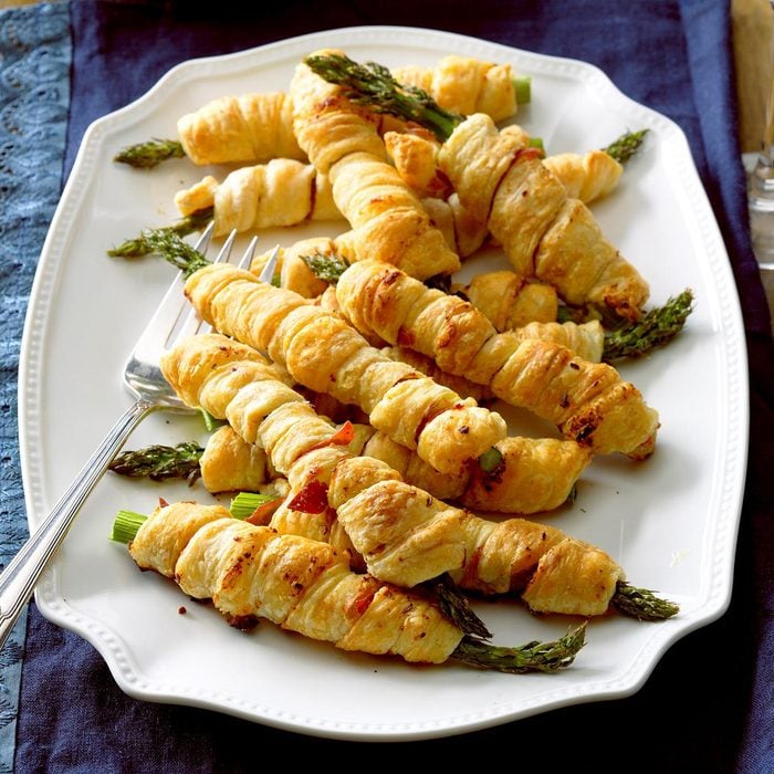 Asparagus makes lovely finger food, especially wrapped in pastry and tasty filling. Easily assembled, it’s perfect for weeknight noshing or something a little fancier for entertaining. —Linda Hall, Evington, Virginia
