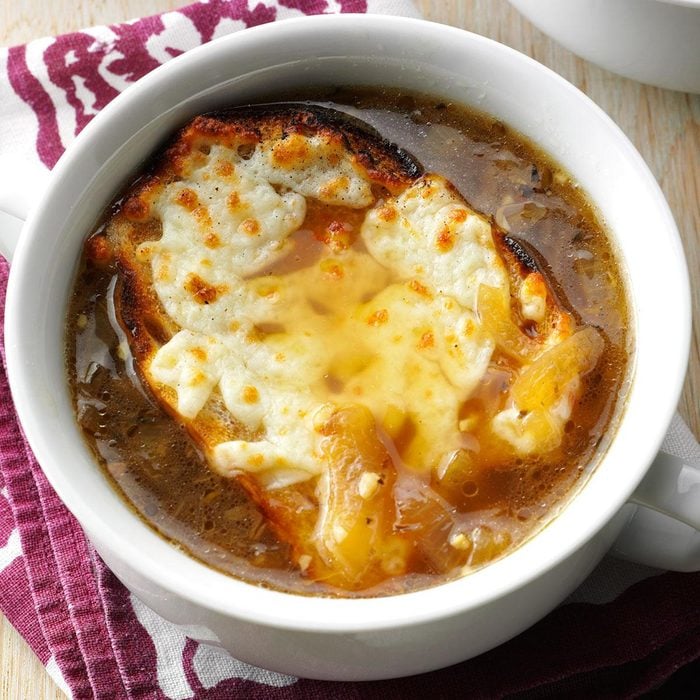 Topped with a slice of cheesy toast hot from the broiler, homemade onion soup is guaranteed to please. Add a green side salad for a complete meal. —Hildy Schlegel, Addison, New York