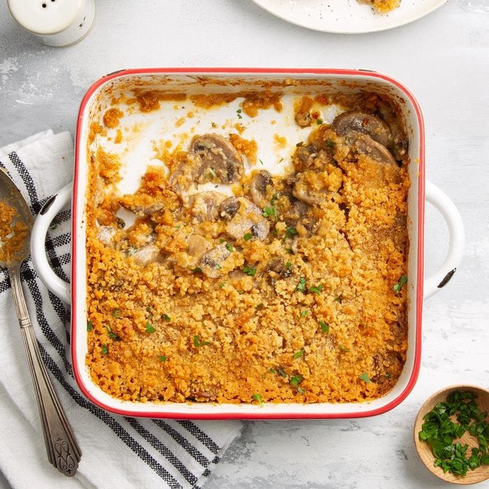 This meatless mushroom casserole is one of my all-time favorites. Loaded with mushrooms and draped in a rich sauce, it’s a home-style side dish that will have everyone scooping up seconds.—Rosemary Janz, Concord, North Carolina