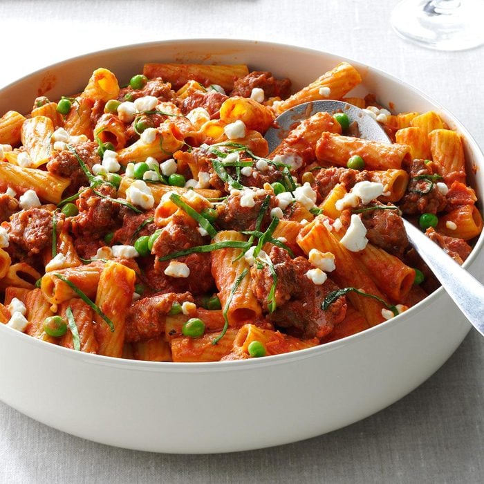 This quick weeknight rigatoni recipe is comfort in a bowl thanks to Italian sausage, a creamy tomato sauce and tangy goat cheese. Can’t find goat cheese at the store? You can use feta instead.